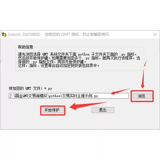 选择上一步的你原来的 QMT 安装目录下面,子文件夹 python下面的指标模型文件,然后点击“开始保护”。